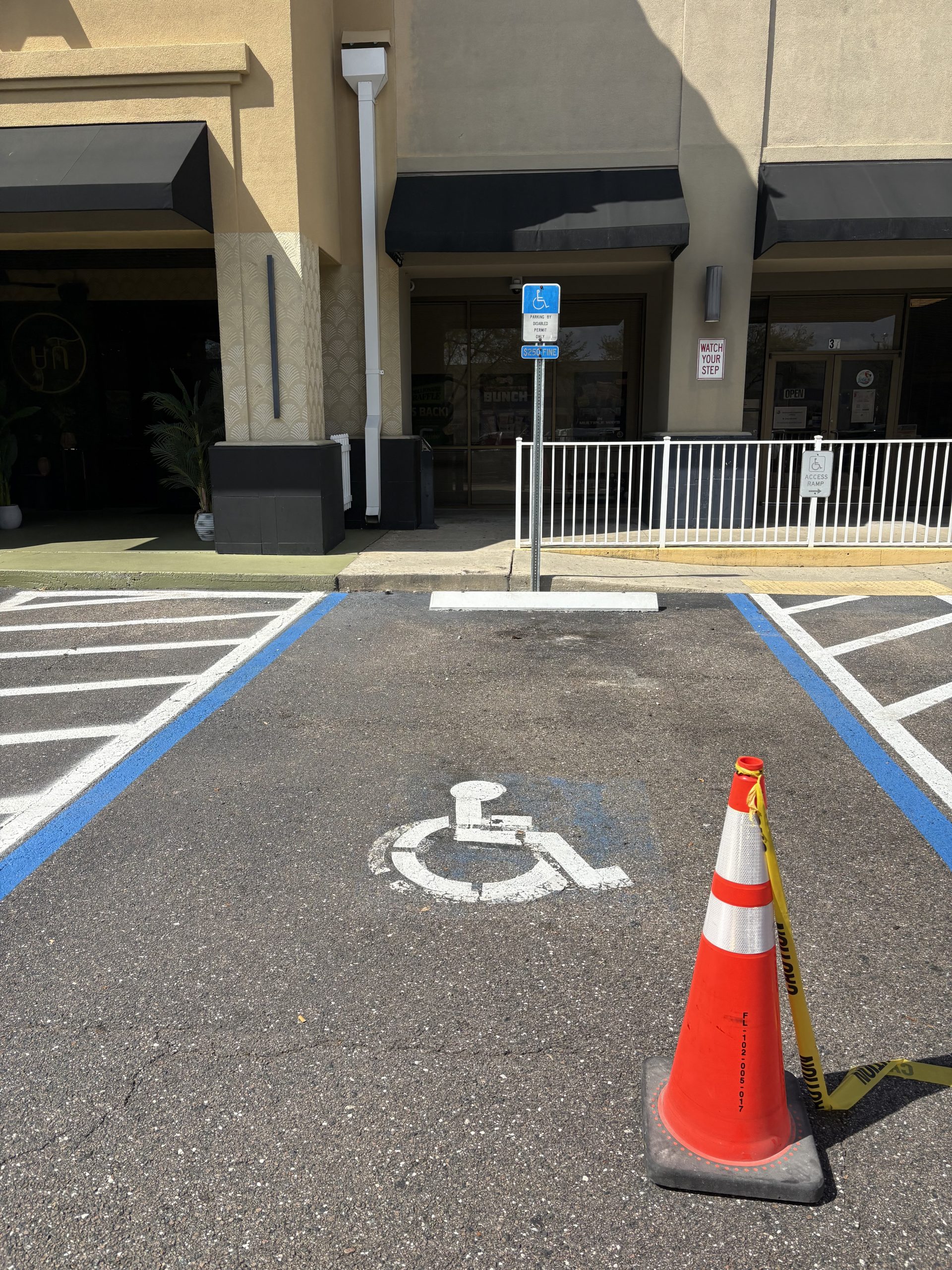 PLEASE INSTALL 2 CAR STOPS IN THE HANDICAP SPACES IN FRONT OF THE LOTTERY SPACE