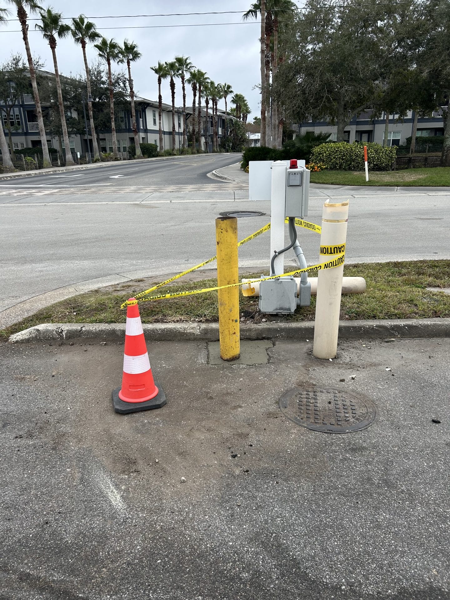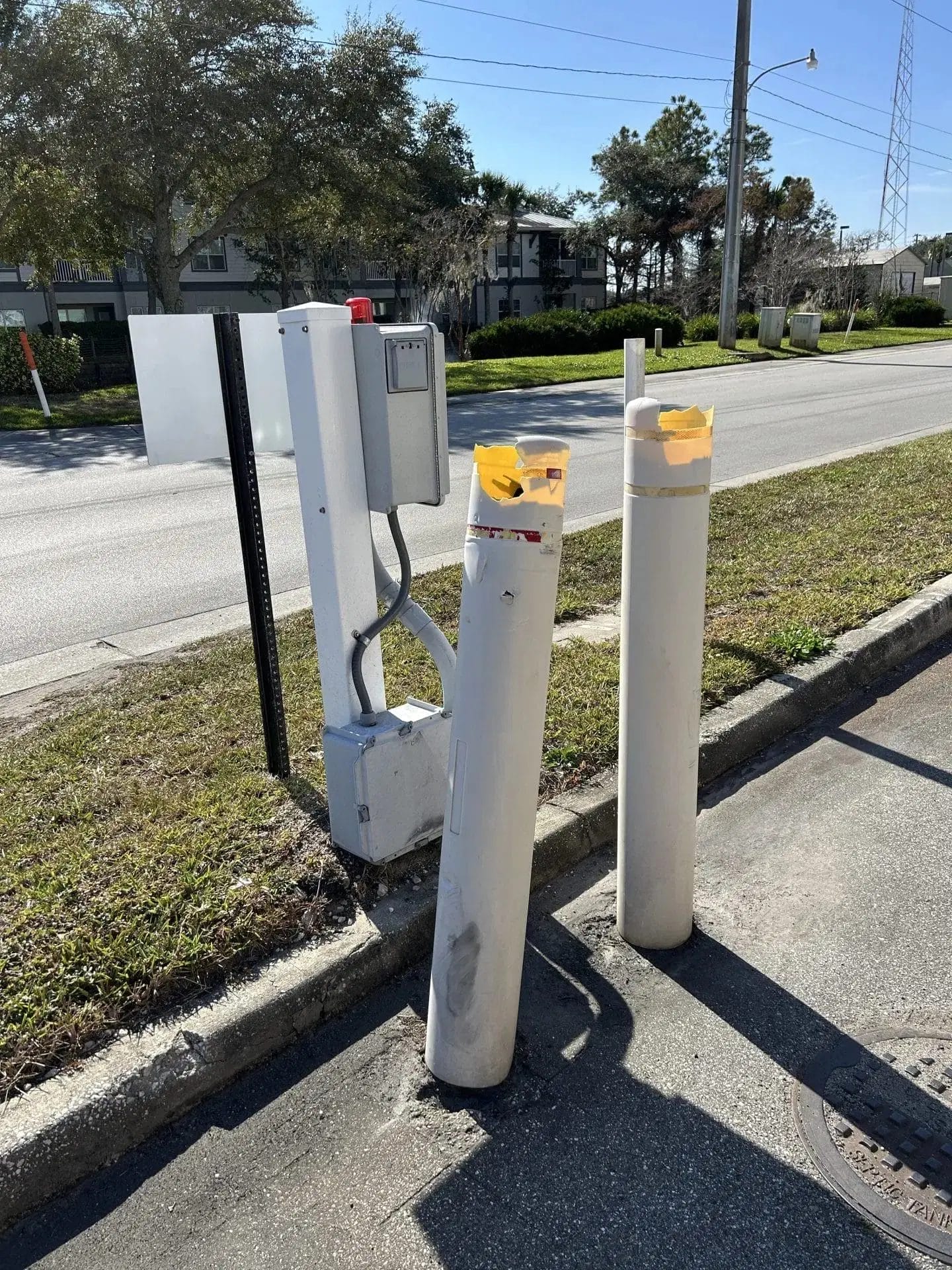 There are two bollards behind Southern Swells that need repaired. One of the bollards is leaning over and needs straightened, and both bollards need new covers. Can CMGS please provide an estimate to perform this work? See attached picture for reference.