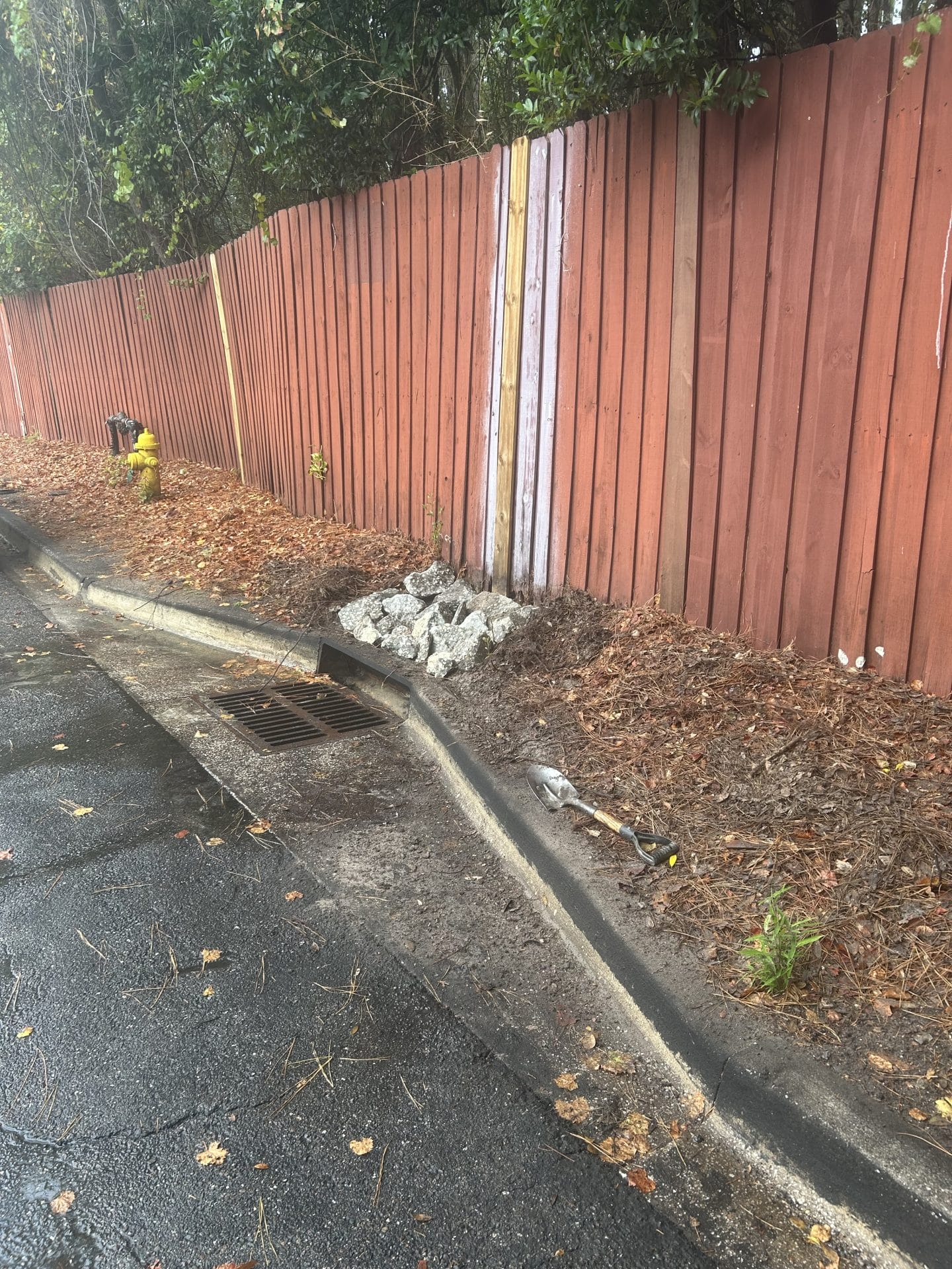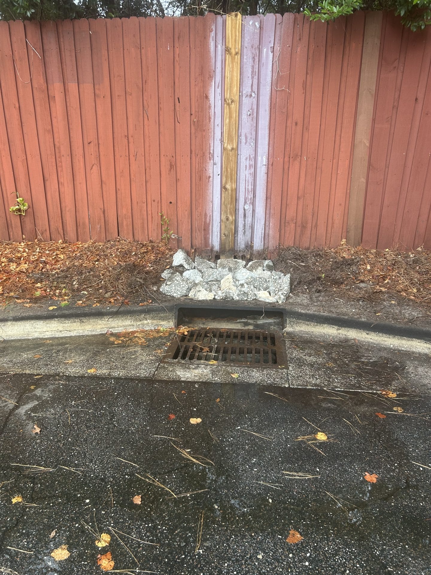 Please move at least some of the rip rap over to the dirt area right behind the storm basin. The main purpose of the rip rap is to keep the dirt from getting into and clogging the storm system.